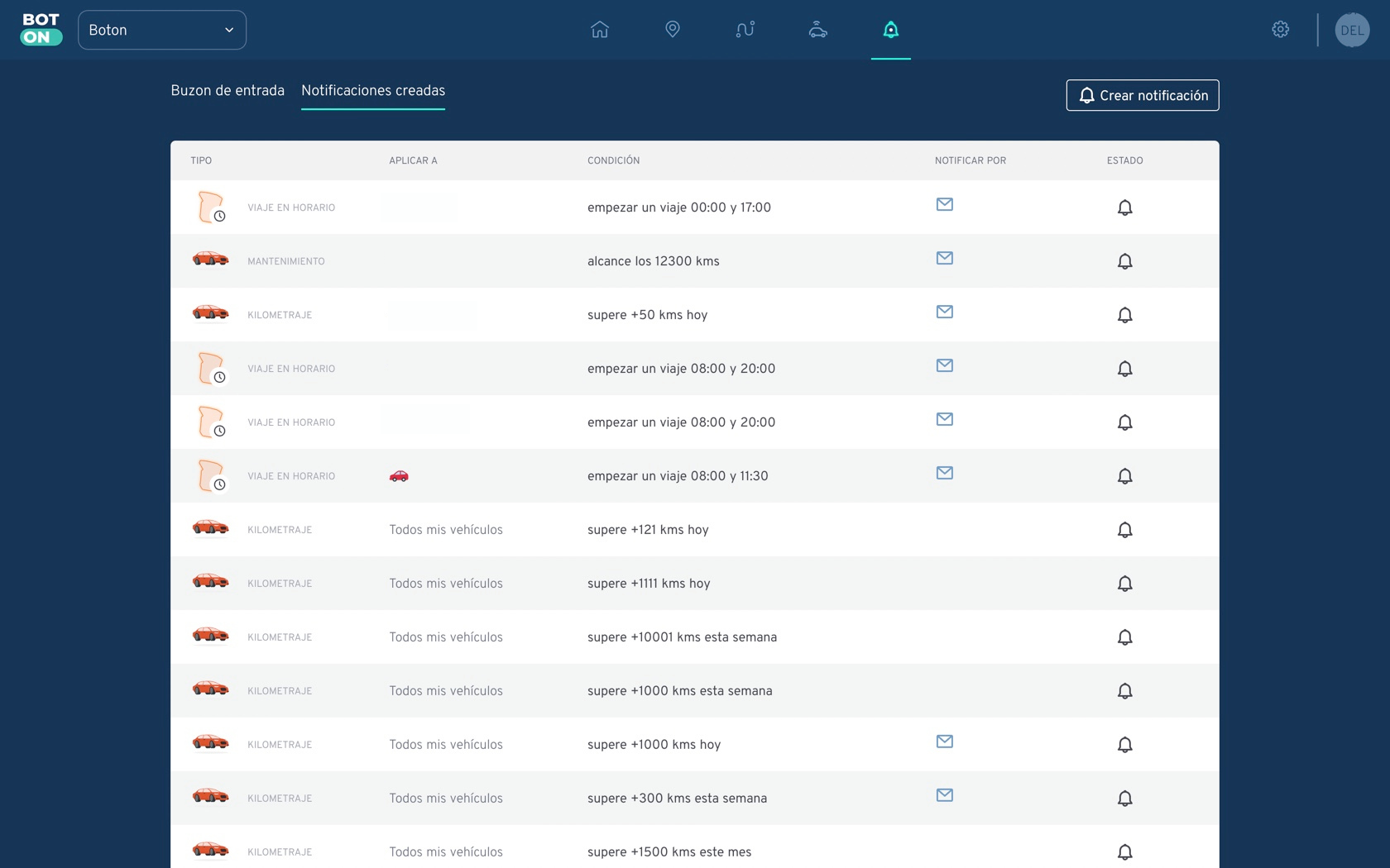 El menú Alertas de BotOn está pensado para hacerte la vida más fácil y que puedas olvidarte de hacer el seguimiento del kilometraje de tus vehículos, conocer en qué momento se utilizan o recordar los mantenimientos periódicos.