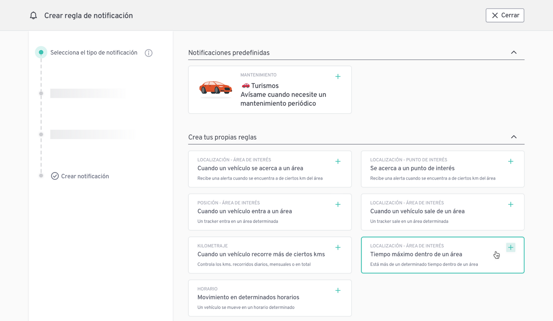 Déjanos explicarte el potencial: cuando predefines una notificación, puedes elegir si quieres ser avisado cuando un vehículo se acerca o aleja de un área o punto de interés, cuando entra o sale de ella, o el tiempo máximo que permanece en una zona.